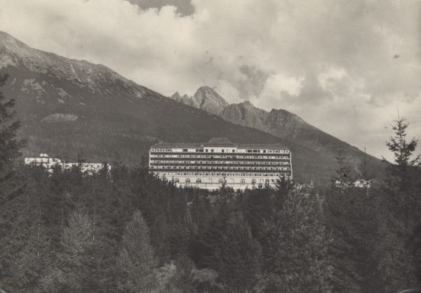 Widok na budynek sanatorium w miejscowości Nowy Smokowiec. W tle grupa Łomnicy. Po lewej stok Sławkowskiego Szczytu.