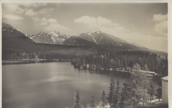 Widok z Hotelu Krywań na Szczyrbskie Jezioro. W tle Popradzka Kopa, Wysoka, Osterwa, Tępa i Kończysta.