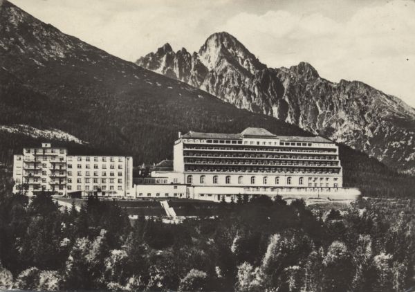 Widok na budynki sanatorium w Nowym Smokowcu. W tle po lewej stok Sławkowskiego Szczytu, Durny Szczyt, Poślednia Turnia i Łomnica.