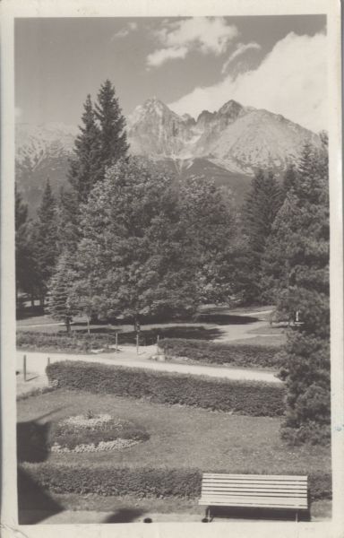 Vysoké Tatry - Tatr. Lomnica. Park v pozadí Lomnickę 2634 m a KeŸmarskę čtít 2556 m n. m.