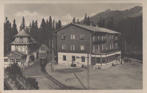 Hotel Solisko i dworzec kolei elektrycznej w Szczyrbskim Jeziorze. W tle Krywań i Siodełkowa Kopa.