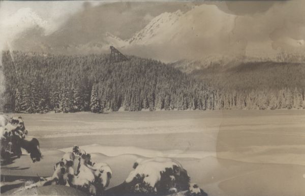Widok na zamarznięte i zasypane ¶niegiem Szczyrbskie Jezioro. W głębi widać star± skocznie narciarsk±. W tle od lewej: Solisko, Szczyrbski Szczyt i Grań Baszt.