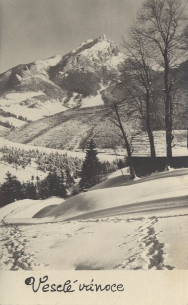 Zimowy widok z Małej Fatry. Po prawej stronie dom, w głębi las. Pod zdjęciem życzenia: Veselé vánoce.
