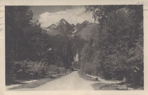 Widok z Tatrzańskiej Łomnicy. Przy ulicy ze szpalerami drzew kościół ewangelicki. W tle widoczne: Łomnica, Widły i Kieżmarski Szczyt.