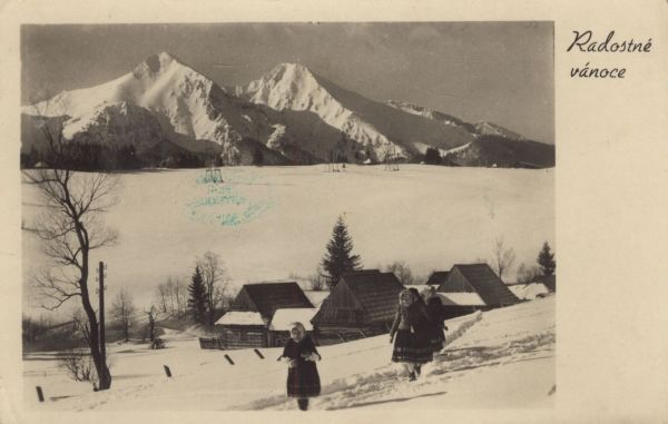 Zimowy widok na Tatry Bielskie ze Zdziaru. Na pierwszym planie 5 dziewczynek, za nimi drewniane domy i drzewa. W tle Płaczliwa Skała i Hawrań. Obok fotografii życzenia świąteczne: Radostné vánoce.