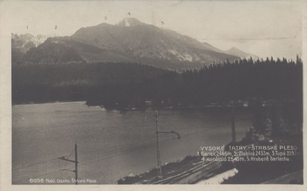 Szczyrbskie Jezioro. W dole widoczne tory kolei elektrycznej z Popradu. W tle Ganek, Żłobisty Szczyt, Tępa, Kończysta i Gerlach. Na dole wpisany tytuł i nakładca.