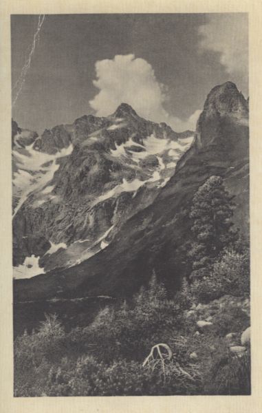 Otoczenie Zielonego Stawu Kieżmarskiego. Pośrodku Czarny Szczyt, z prawej Jastrzębia Turnia.