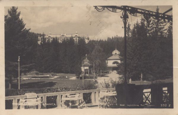Taras hotelu Łomnica w Tatrzańskiej Łomnicy. Widok na park zdrojowy i Grand Hotel Praga. Na dole wpisany tytuł i nakładca.