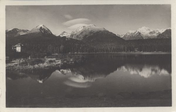 Szczyrbskie Jezioro, z lewej nad brzegiem willa Marina. W tle Solisko, Szczyrbski Szczyt, Skrajna Baszta, Popradzka Kopa i Wysoka.