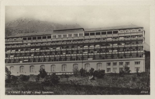 Budynek sanatorium w miejscowości Nowy Smokowiec. W tle po lewej Sławkowski Szczyt. Na dole po lewej stronie wpisany tytuł.