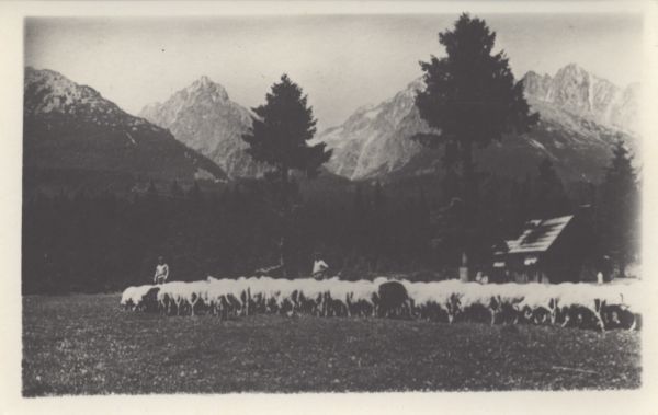 Górale ze stadem owiec. W tle Pośrednia Grań.