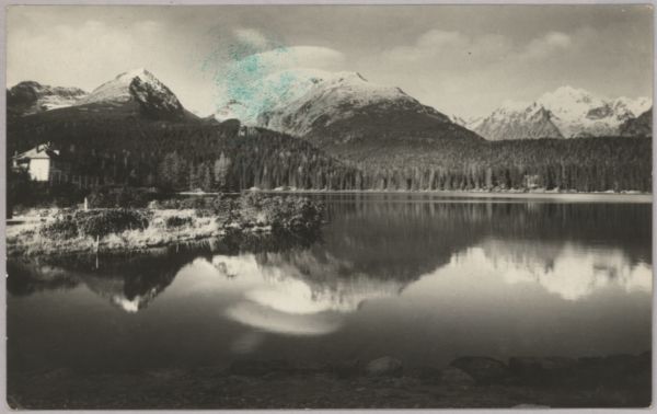 Szczyrbskie Jezioro, z lewej nad brzegiem willa Marina. W tle Solisko, Szczyrbski Szczyt, Skrajna Baszta, Popradzka Kopa i Wysoka.