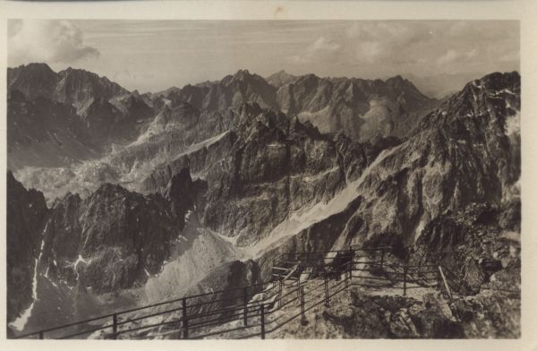 Widok z Łomnicy na zachód: na horyzoncie Gerlach, Wysoka, Krywań i Rysy. Po prawej Lodowa Kopa, na wprost Mały Lodowy Szczyt nad Dolin± Małej Zimnej Wody. Na szczycie Łomnicy widoczna platforma widokowa.
