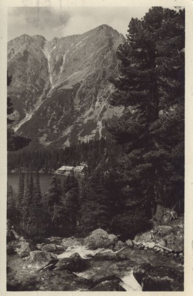 Zmarzły Potok w Dolinie Złomisk. W dole schronisko nad Popradzkim Stawem w Dolinie Mięguszowieckiej. W tle Pośrednia Baszta.