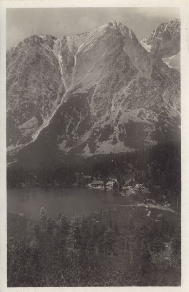 Widok na Popradzki Staw w Dolinie Mięguszowieckiej z drogi na Osterwę. Nad brzegiem budynek schroniska. W tle Skrajna Baszta i Pośrednia Baszta.