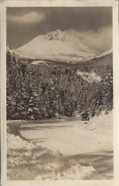 Widok na Gerlach z Drogi Wolności w zimie. Na drodze widoczny samochód.