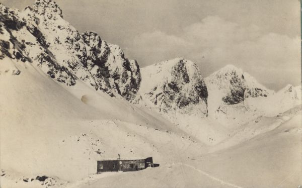 Schronisko Zbójnickie w Dolinie Staroleśnej zimą. W tle Staroleśny Szczyt, Baniasta Turnia i Mała Wysoka.
