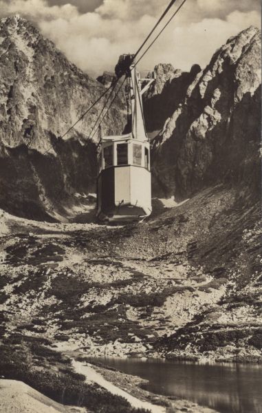 Wagonik kolei linowej na Łomnicę. W dole Łomnicki Staw. W tle Łomnica i Kieżmarski Szczyt.