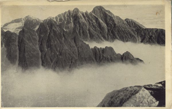 Widok na Pośrednią Grań i grupę Łomnicy nad chmurami.