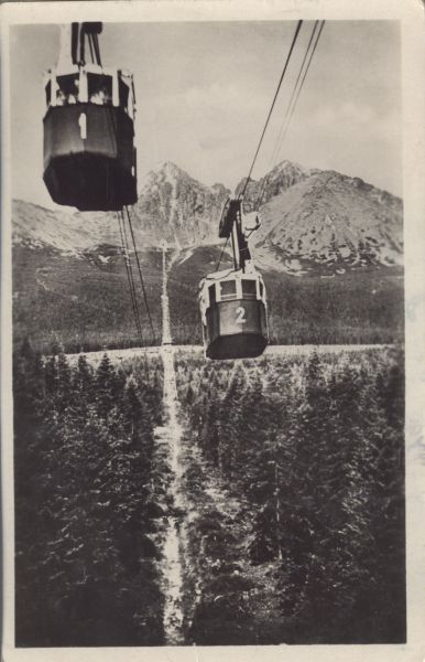 Wagoniki kolei linowej na Łomnicę podczas mijania. W tle Łomnica i Kieżmarski Szczyt.
