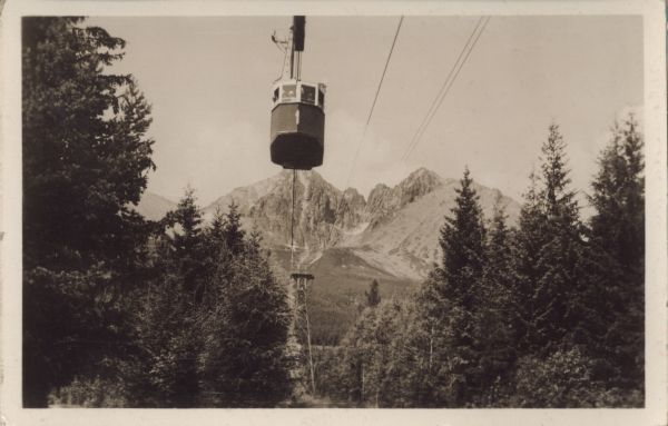 Wagonik kolei linowej na Łomnicę. W tle Łomnica i Kieżmarski Szczyt.