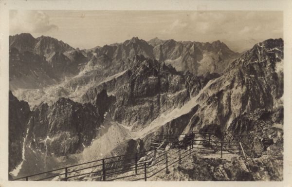 Widok z Łomnicy na zachód, taras na szczycie. W tle z lewej Gerlach, po¶rodku Wysoka i Rysy, z prawej Lodowy Szczyt.