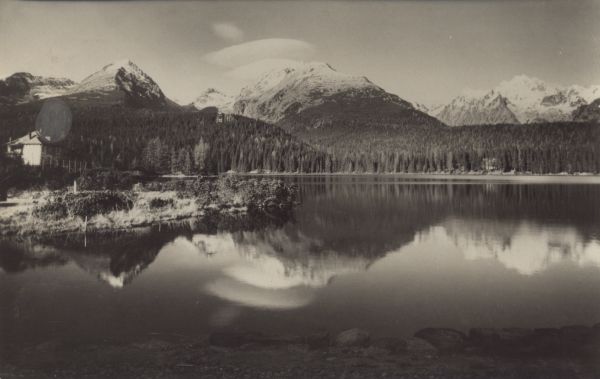 Widok znad Szczyrbskiego Jeziora: Wielkie Solisko, Skrajna Baszta, Popradzka Kopa i Wysoka. Z lewej nad brzegiem widoczna willa Marina.