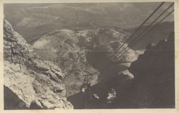 Widok z Łomnicy do Doliny Łomnickiej i na trasę kolei linowej. Obok przęsła wagonik. W dole widoczny Łomnicki Staw.