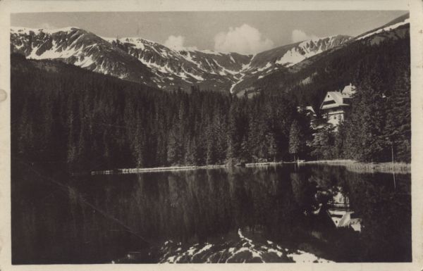 Widok na Wrbicki Staw w Jasnej i jego otoczenie. Nad stawem schronisko Mikołaja. W tle przełęcz Poµany i szczyt Poµana (na prawo).