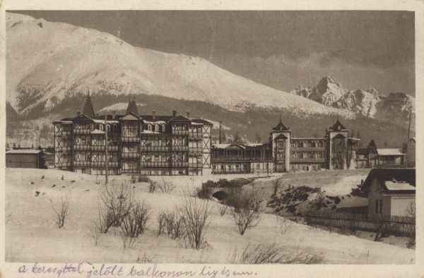 Budynek i otoczenie sanatorium dr. Szontagha w Nowym Smokowcu w scenerii zimowej. W tle ośnieżone szczyty Tatr Wysokich. (Na dolnym marginesie odręczne notatki).