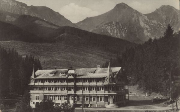Belanské Tatry - źdiar ROH - Zdravá generácia. Zotavovòa "Tatra" v pozadí źdiarske Vidly 2148 m n. m. Havran 2154 m n. m.