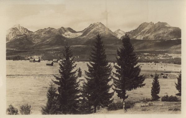 Szałasy na ważeckich ł±kach. W tle panorama Tatr od południa.