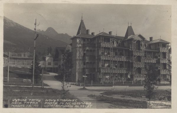 Budynek i otoczenie sanatorium dr. Szontagha w Nowym Smokowcu. Na dole po lewej stronie wpisany tytuł pocztówki, po prawej nakładca.