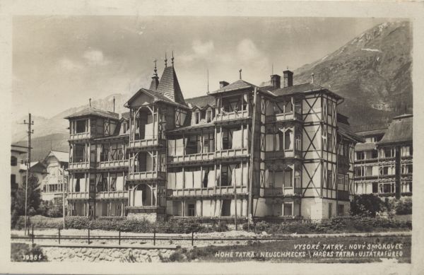 Budynek i otoczenie sanatorium dr. Szontagha w Nowym Smokowcu. Na dole po prawej stronie wpisany tytuł, również w języku niemieckim i węgierskim.