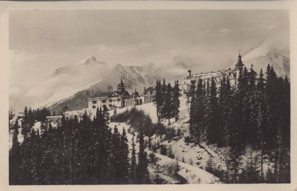 Hotele w Szczyrbskim Jeziorze w zimie. W tle Krywań.
