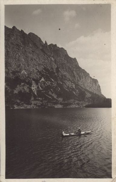 Łódź na Popradzkim Stawie w Dolinie Mięguszowieckiej. W tle Osterwa.