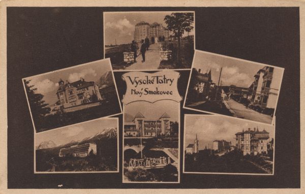 Pocztówka 6. elementowa. Na kolejnych zdjęciach przedstawiono sanatoria w Nowym Smokowcu. W centrum napis: Vysoké Tatry, Nový Smokovec.