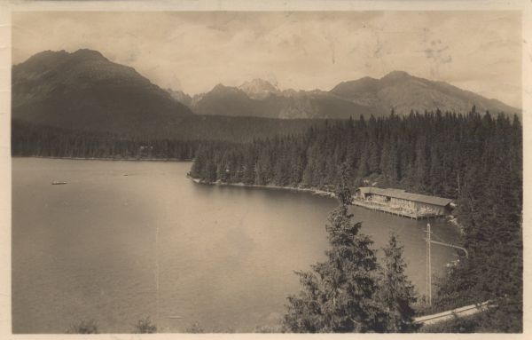 Widok z Grand Hotelu na Szczyrbskie Jezioro i kąpielisko z prawej. W tle Skrajna Baszta, Popradzka Kopa, Wysoka i Kończysta.