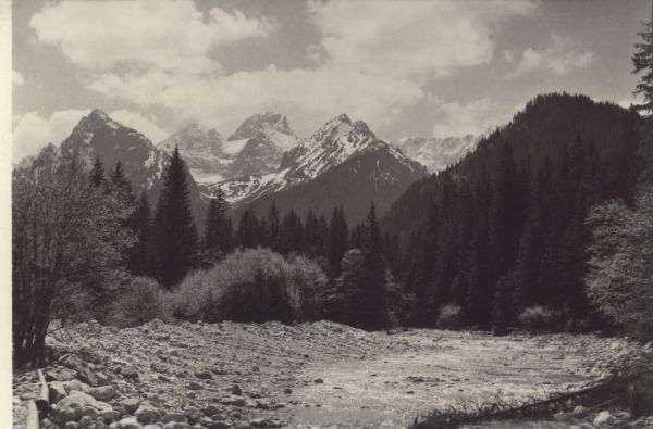 Panorama Tatr Wysokich z Doliny Białej Wody. Tytuł również w języku: ros., niem., ang.