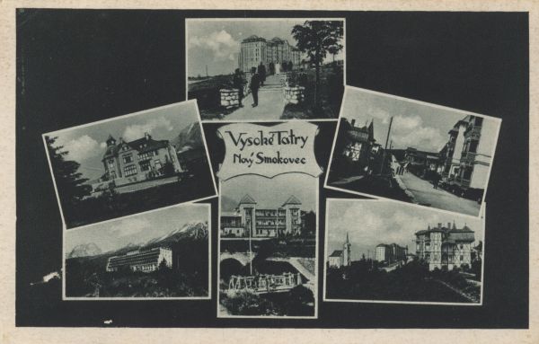 Pocztówka 6. elementowa. Na kolejnych zdjęciach przedstawiono sanatoria w Nowym Smokowcu. W centrum napis: Vysoké Tatry, Nový Smokovec.