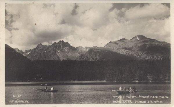 Łodzie na Szczyrbskim Jeziorze. W tle Popradzka Kopa, Wysoka, Osterwa, Tępa i Kończysta. Na dole wpisany tytuł, również w języku niemieckim i nazwisko fotografa.