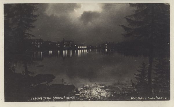 Szczyrbskie Jezioro noc±. Nad brzegiem widoczne ¶wiatła hoteli Krywań i Hviezdoslav. Na dole wpisany tytuł i nakładca.