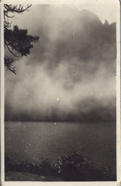 VYSOKÉ TATRY: Popradské Pleso 1513 m. n. m. "Osterva" v mlze.