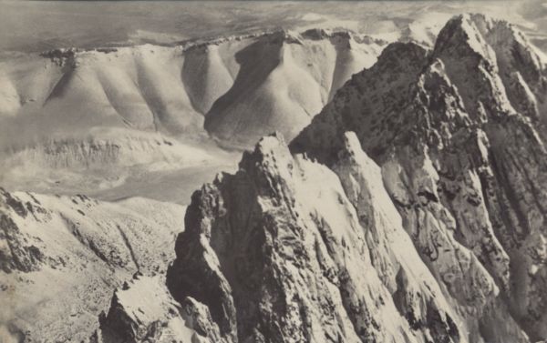 Zimowy widok z Łomnicy na wschód. Z prawej Kieżmarski Szczyt, w tle grań Tatr Bielskich.