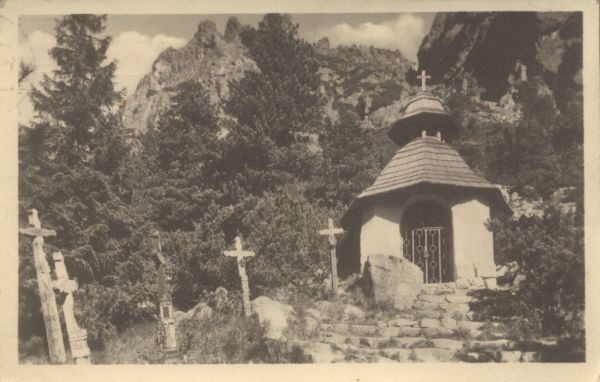 Kaplica na Cmentarzu symbolicznym pod Osterwą w Dolinie Mięguszowieckiej. Po lewej stronie drewniane krzyże, w tle drzewa i urwiska Osterwy.
