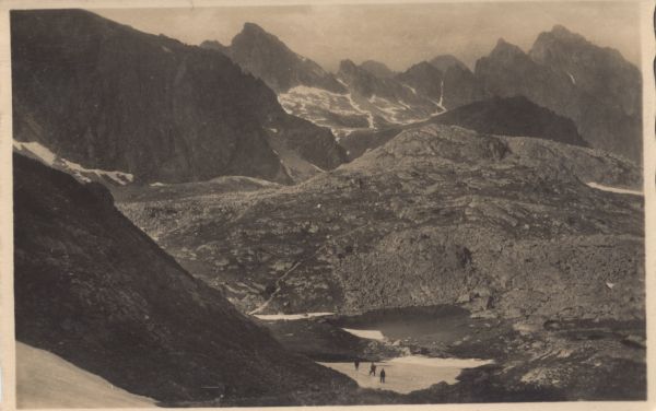 Zbójnickie Stawy w Dolinie Staroleśnej. Na płacie śniegu 3 turystów. W tle Mały Lodowy Szczyt i Łomnica.