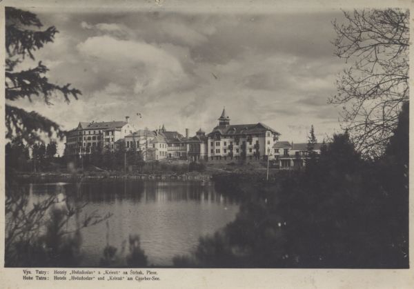 Hotele Hviezdoslav i Krywań w Szczyrbskim Jeziorze. Pod zdjęciem tytuł, również w języku niemieckim.