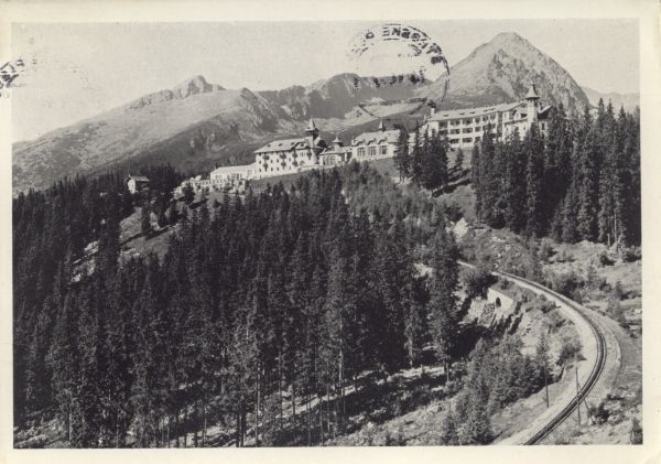 Kolej zębata do Szczyrbskiego Jeziora. Pośrodku widoczny Hotel Hviezdoslav. W tle Krywań, Siodełkowa Kopa, Ostra i Solisko.