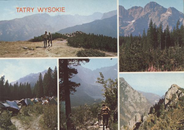 Pocztówka 5. elementowa: Widok ze Świstówki Roztockiej. Mięguszowieckie Szczyty w Dolinie Rybiego Potoku. Pole namiotowe na polanie Włosienica. Szlak na Świstówkę, w głębi Morskie Oko. Wołoszyn, Dolina Roztoki i Opalone. U góry po lewej stronie napis TATRY WYSOKIE.