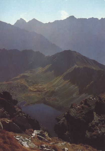 Widok na Zadni Staw Polski ze Świnicy. Nad nim Gładki Wierch. W tle Hruba Grań.